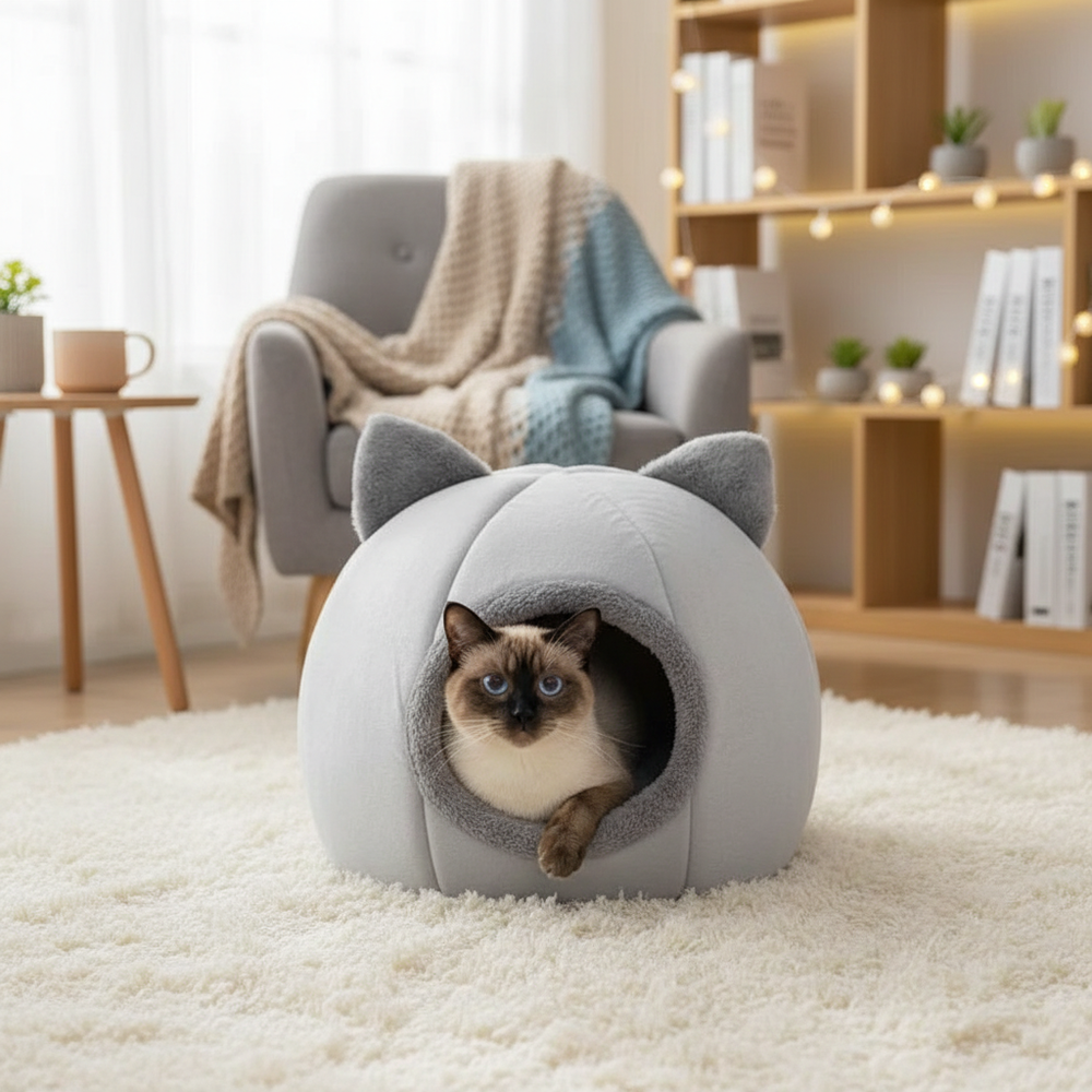 Lekka konstrukcja sprawia, że jaskinia jest łatwa do przenoszenia i ustawienia w dowolnym miejscu w domu. Antypoślizgowa powierzchnia na spodzie zapewnia stabilność nawet na śliskich podłogach. Wyjmowana poduszka ułatwia utrzymanie czystości i szybkie odświeżenie legowiska. To idealne legowisko dla kotów, które lubią zamknięte, osłonięte przestrzenie.